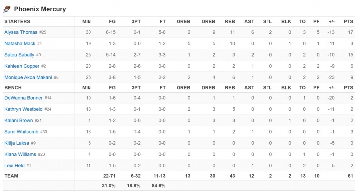水星这边,只有艾丽莎-托马斯(17分11板6助2断)和萨托-萨巴利(15分)两人上双。队中另一位明星球员卡莉亚-库珀,本场只打了20分就肋骨受伤离场。